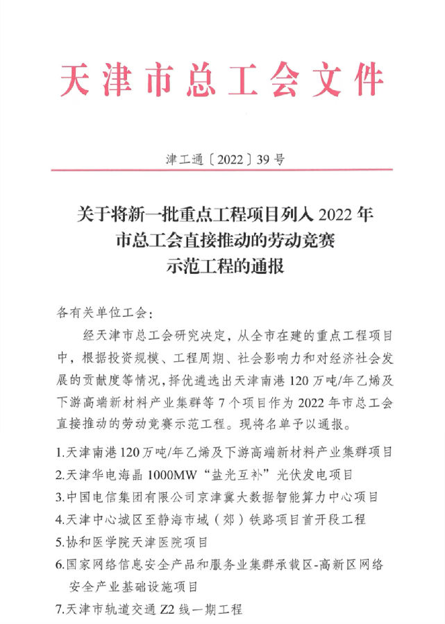 近日,公司天津網絡安全中心項目獲評2022年天津市勞動競賽示范工程。該獎項根據投資規模、工程周期、社會影響力和對經濟社會發展的貢獻度等情況,從全市在建的重點工程項目中擇優遴選,并發放一次性工作補助資金20萬元。天津市僅有7個項目成功入選,公司天津網絡安全中心項目榮列其中。