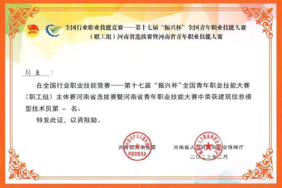 近日,公司華中分公司青年職工劉臣,在全國行業(yè)職業(yè)技能競賽——第十七屆振興杯全國青年職業(yè)技能大賽(職工組)主體賽河南省選拔賽暨河南省青年職業(yè)技能大賽中榮獲建筑信息模型技術員一等獎。
