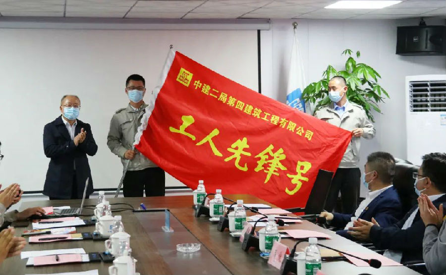 濱海新區(qū)總工會副主席李慶國為天津網(wǎng)絡(luò)安全中心項目工人先鋒號授旗;