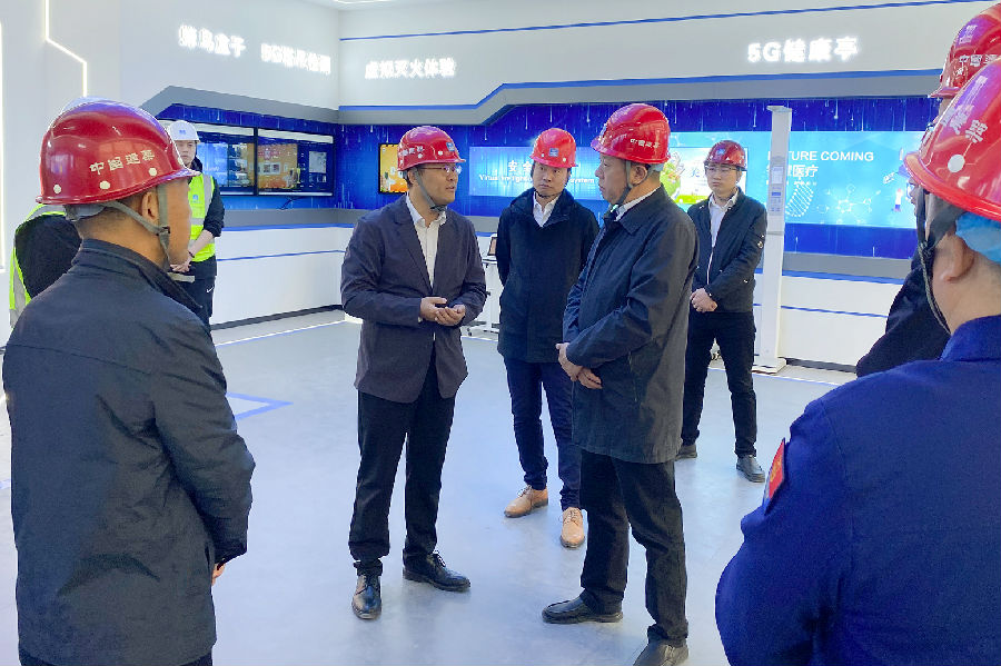 尹曉峰一行深入施工現場,對項目現場及工人生活區的消防設施和高空作業等情況進行全面檢查,同時聽取了項目負責人王忠關于施工進度、工期節點、消防安全等相關介紹,并參觀了項目的智慧展廳。檢查過程中,尹曉峰對消防器材是否完好,宿舍區內用電是否規范,消防通道及安全出口是否暢通,宿舍管理員消防安全常識是否掌握等情況進行重點檢查,對項目消防安全的規范化表示認可。