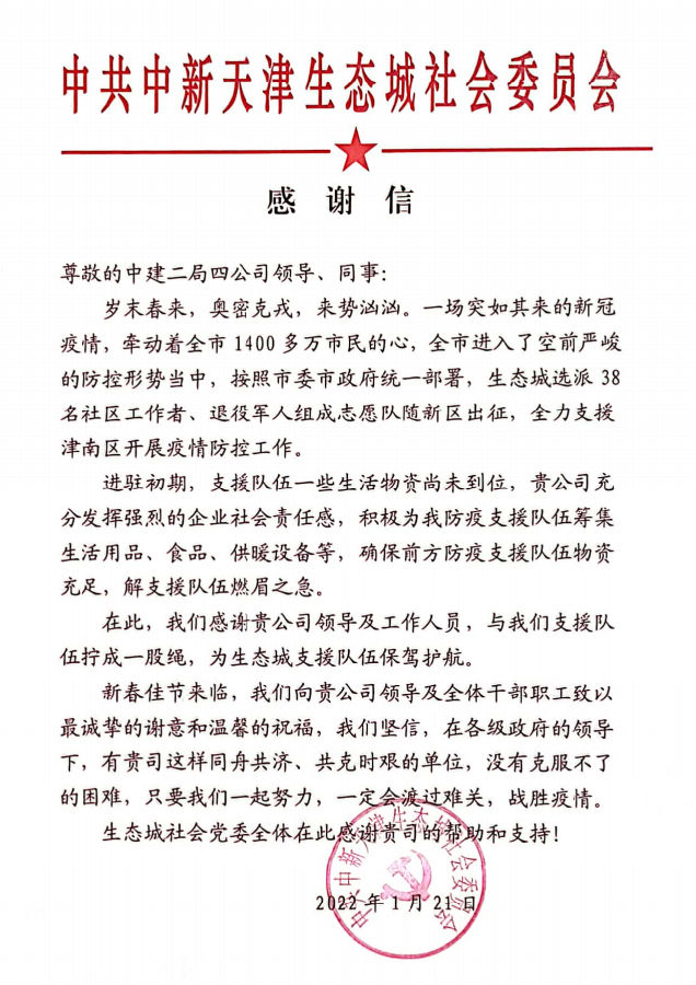 近日,公司收到來自共青團(tuán)天津市濱海新區(qū)委員會(huì)和中共中新天津生態(tài)城社區(qū)委員會(huì)的表揚(yáng)信,信中對(duì)公司積極為疫情防控一線工作者捐贈(zèng)物資的行為給予了充分肯定和贊揚(yáng)。